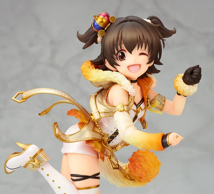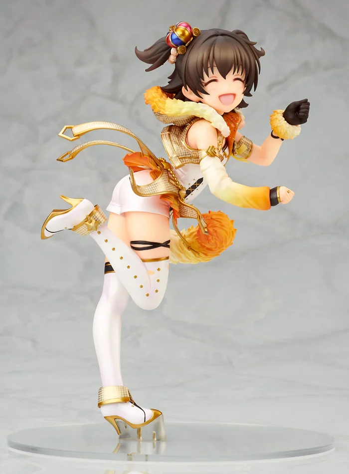Get ready for a stellar performance, Producers! The Idolm@ster Cinderella Girls’ Miria Akage comes to us thanks to Alter in her Party Time Gold outfit! Miria-chan’s outfit is lovingly painted in gold and cream colors, save for the crown on her head, which adds a splash of royal red and blue to the ensemble. Perfectly balanced on one leg with the help of a stand, the young idol can wear two different options for her face, both looking as exuberant as her song “Fluffy Tale.” Speaking of tails, we adore the fluffy tail accessory and hoodie lining that gradually become more orange. The whole piece makes our hearts go doki-doki!