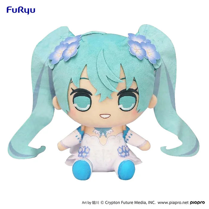 Cuddle up with Vocaloid sweetheart Hatsune Miku in a fairy-inspired look! From FuRyu’s Kyurumaru line comes a big plush toy of Hatsune Miku in a lovely fairy-like outfit with nemophila flowers in her hair. Her embroidered expression and big, bright eyes give her a charm that’s hard to resist. Enjoy her soothing presence as part of your decor!
