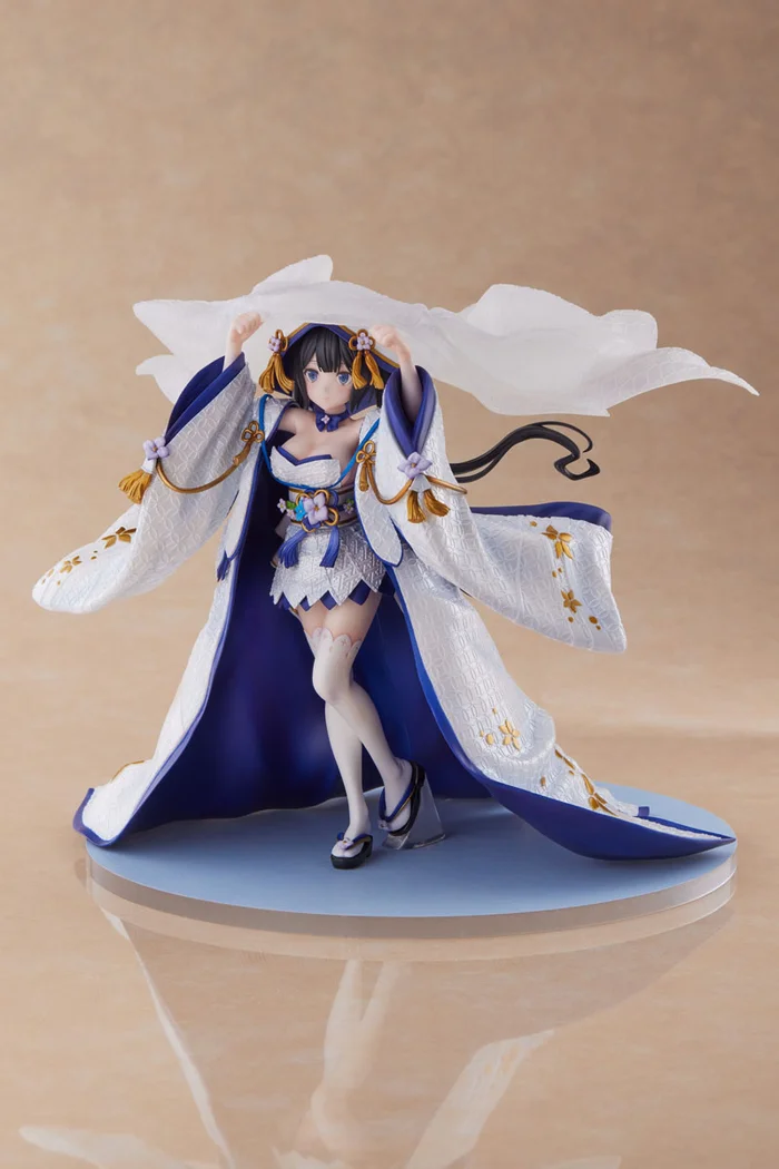From Is It Wrong to Try to Pick Up Girls in a Dungeon? Ⅳ comes an irresistible figure of the goddess Hestia! Sculpted by Iso and Yamachi (Moineau) to 1/7 scale, Hestia-chan measures 8.9″ tall. She’s traded in her usual skimpy white dress for a new skimpy white dress, in combination with an exquisite Shiromuku kimono! Both the kimono and her dress feature an intricate raised pattern that can be felt. The deep blue color found on Hestia’s traditional ribbon can also be found throughout this uniquely designed Shiromuku. With two hands, she holds up a large white veil made from translucent material, floating softly in the breeze. Her long, gorgeous twintails have also taken to the wind! It’s a dreamy vision of Hestia-chan worth adding to your collection!
