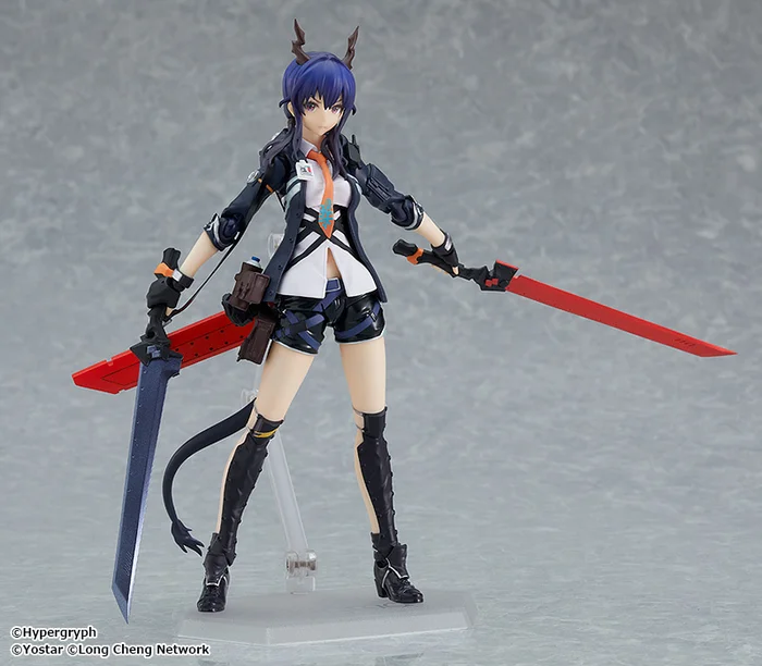 She comes with four face plates to display her smiling looking straight, smiling looking left, glaring, or shouting. Optional parts include her sword Chi Xiao with its scabbard plus a second sword and interchangeable hand parts so you can recreate a variety of poses befitting the badass Rhodes Island Specialist.