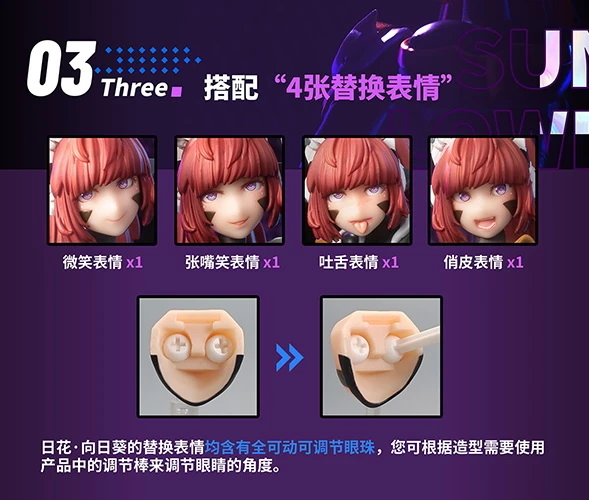 ・4 face parts with fully posable eyes (smiling, laughing, sticking out tongue, grinning)