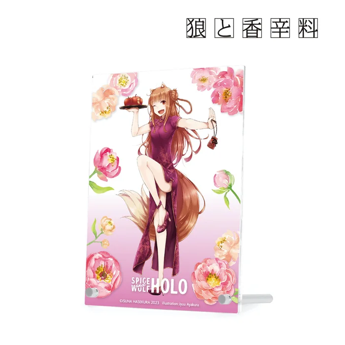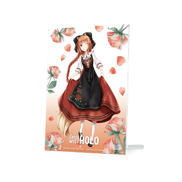 Few heroines are more beloved than Holo from Spice and Wolf, and brand AMNIBUS by arma bianca is honoring the wise wolf with a new lineup of lifestyle and character goods! These collectible double acrylic panels measure 5.8″ x 4.1″, making them easy to display just about anywhere, and feature special artwork drawn by series illustrator Jyuu Ayakura that captures Holo in a variety of lovely looks, including traditional folk outfits, a Santa costume, a Chinese-style dress, and more. Each also comes with a flowery foreground sheet to give it a layered look and two metal feet for display.